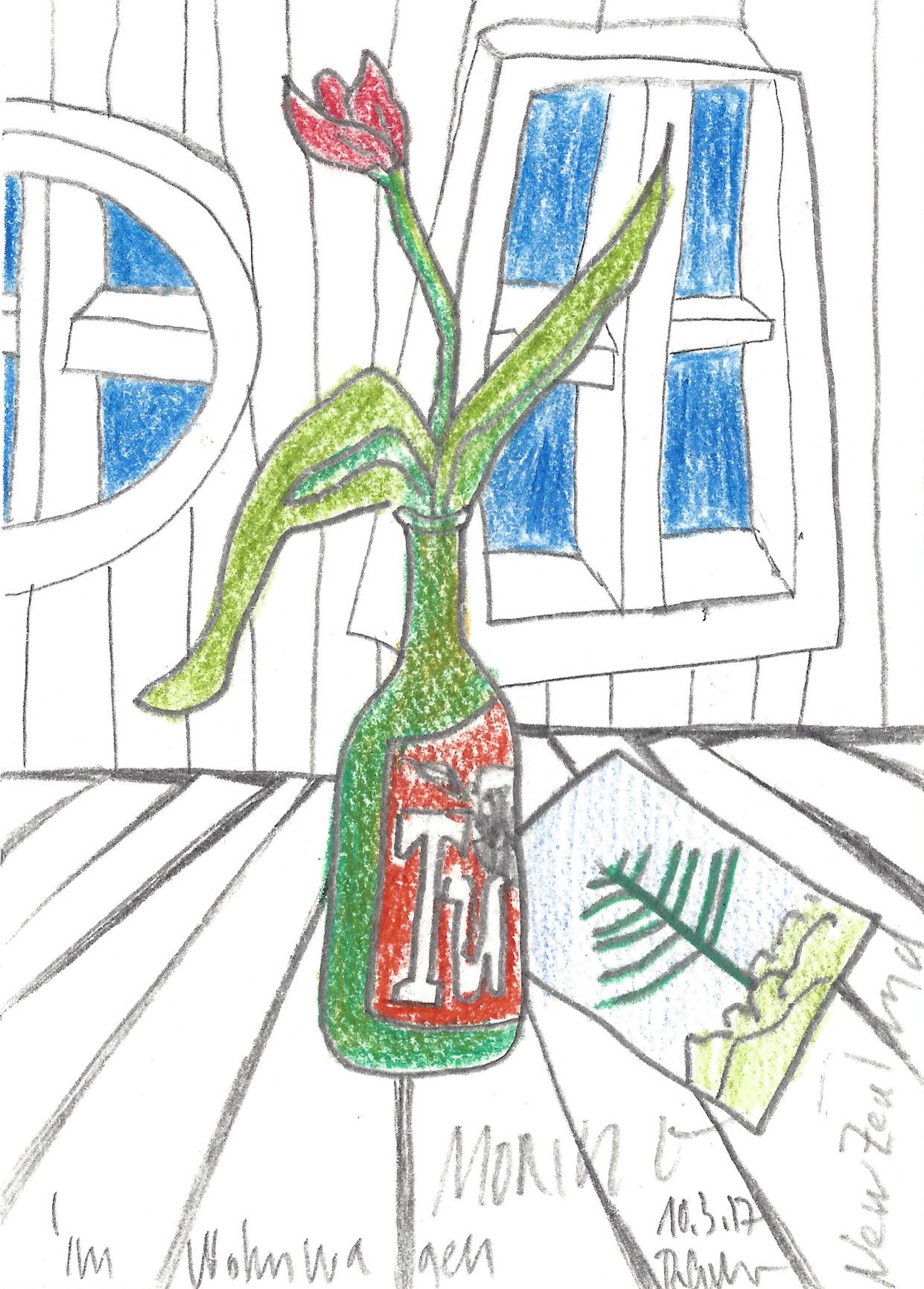 Im Wohnwagen, 2017, Mischtechnik auf Bütten, 15 x 10,5 cm