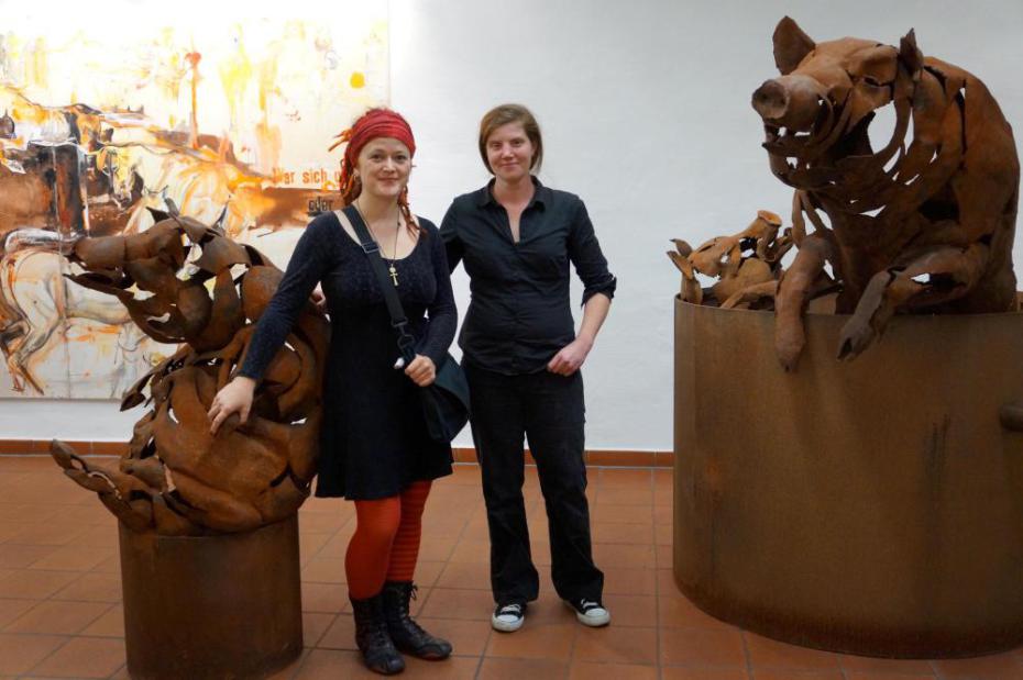 Eine kleine Herde massiger Schweine hält im Herumtollen inne, richtet sich auf und blickt starr geradeaus, während im Hintergrund bunt gescheckte Pferde im Kreis laufen, als drehten sie sich in einem Karussell. Beide Tiergruppen strotzen vor kraftvoller Wildheit. Doch zu hören sind weder Grunzen oder Schnaufen, noch Scharren oder Stampfen. Denn beide Ensembles sind Kunstwerke: Die aus Eisen geschmiedete Schweineherde hat Dana Meyer geschaffen. Die Pferde hat Undine Bandelin über eine 230 mal 360 Zentimeter große Leinwand sprengen lassen.