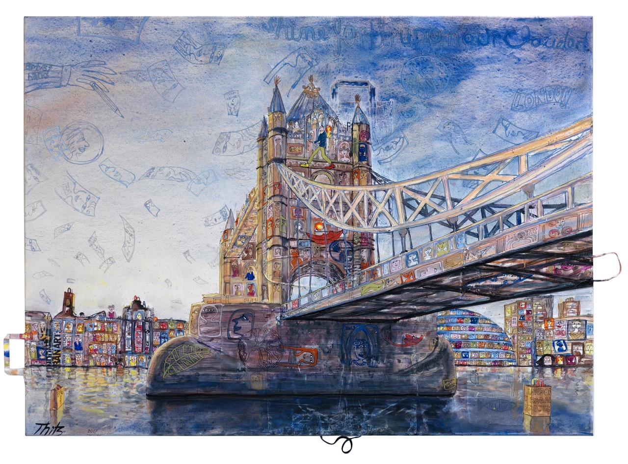 Thitz sammelt Tüten auf allen bewohnten Kontinenten. Er montiert sie auf die Leinwände seiner Gemälde und läßt ganz bewußt ihre Henkel und Kordeln über die Ränder ragen. Diese basiskulturelle Untercollage übermalt er. Seine Motive sind Stadtbilder, Reisebeschreibungen, Utopien und Philosophie zugleich. Sie erzählen tausende kleiner Geschichten aus dem Leben. Thitz ist ein ebenso aufmerksamer wie augenzwinkernder Beobachter menschlichen Tuns. Seine Werke sind Kunst und zugleich Zeitzeugnisse. Zahlreiche Sammler in aller Welt begehren und lieben sie schon jetzt. Ihre ganz große Zukunft als Botschafter unserer Zeit steht ihnen noch bevor.