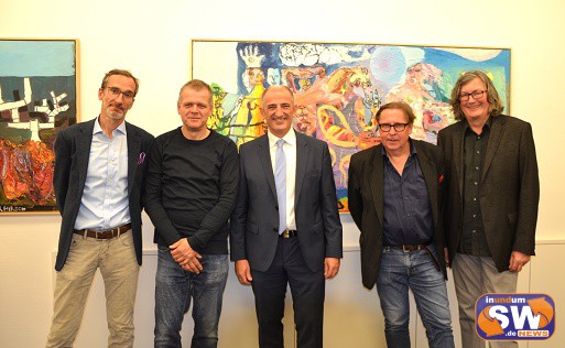 Das Foto (©Alexandra Lang) zeigt von links: Dr. Jörk Rothamel, Galerie Rothamel, Moritz Götze, Roberto Nernosi, Vorstandsmitglied Sparkasse Schweinfurt, Rüdiger Giebler, Adolf Lutz, Kurator Sparkasse Schweinfurt