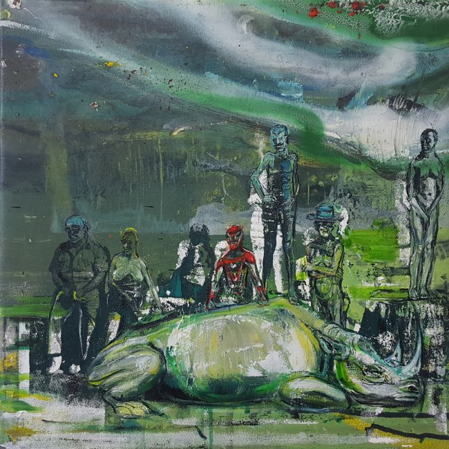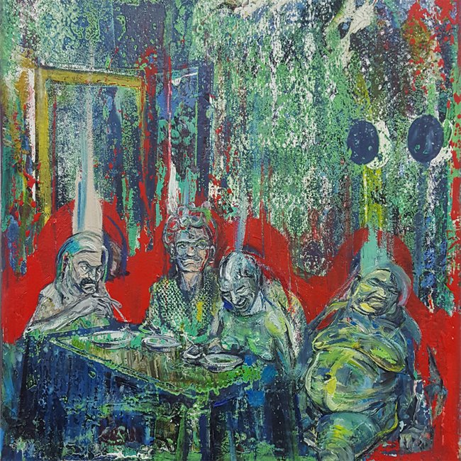 Undine Bandelin, Das Gastmahl, 2020, Siebdruck, Öl und Acryl auf Leinwand, 40 x 40 cm, 1600 Euro