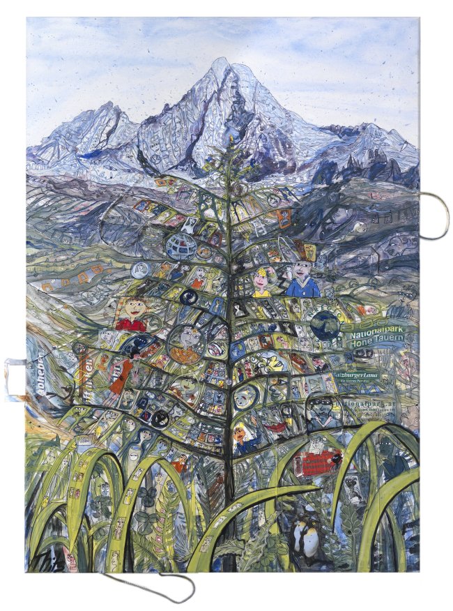 Utopian Civilization Mountain Grossglockner, 2018, Acryl und Tüten auf Leinwand, 140 x 100 cm, 13200 Euro