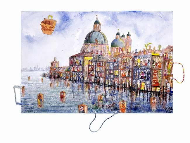 Venezia Visita Utopica, 2022, Acryl und Tüten auf Leinwand, 140 x 200 cm, 18700 Euro
