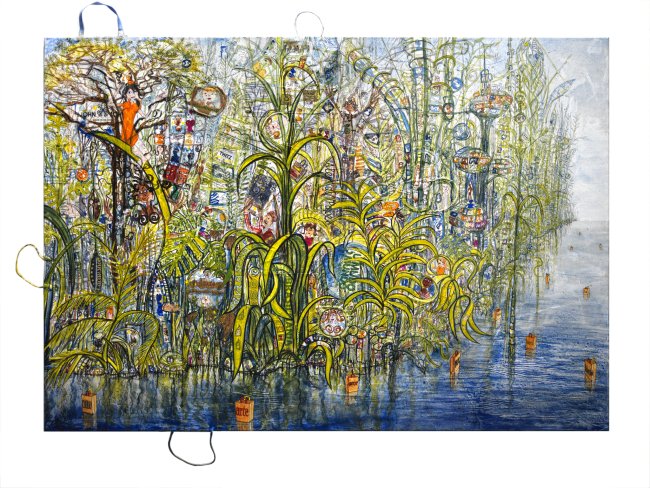 Amazonia Utopica, 2020, Acryl und Tüten auf Leinwand, 140 x 200 cm, 17.000 Euro