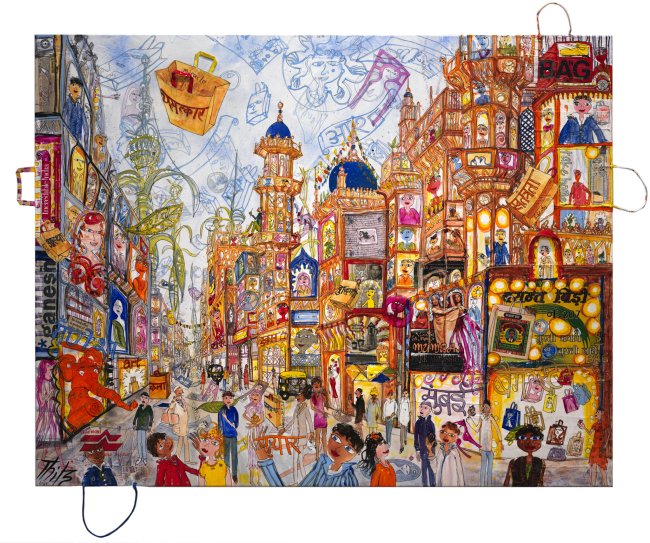 Mumbai Utopian City, 2021, Acryl und Tüten auf Leinwand, 140 x 180 cm, 16.000 Euro