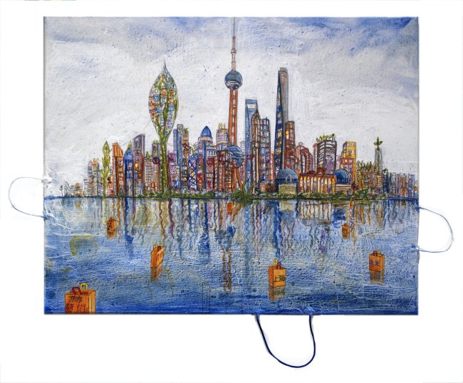 Shanghai Utopia, 2020, Acryl und Tüten auf Leinwand, 80 x 100 cm, 9.000 Euro