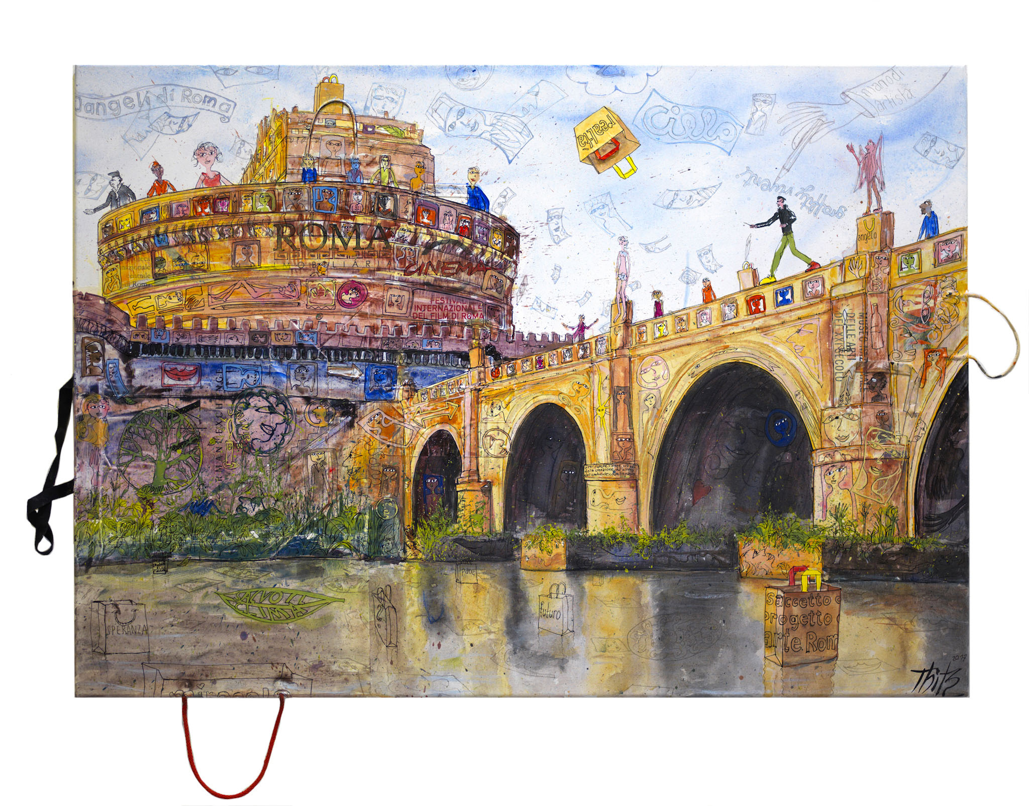 Rome Angels, 2017, acrylic and bags on canvas, 100 x 140 cm