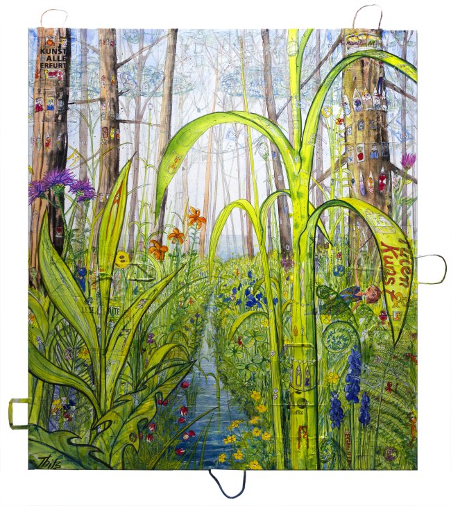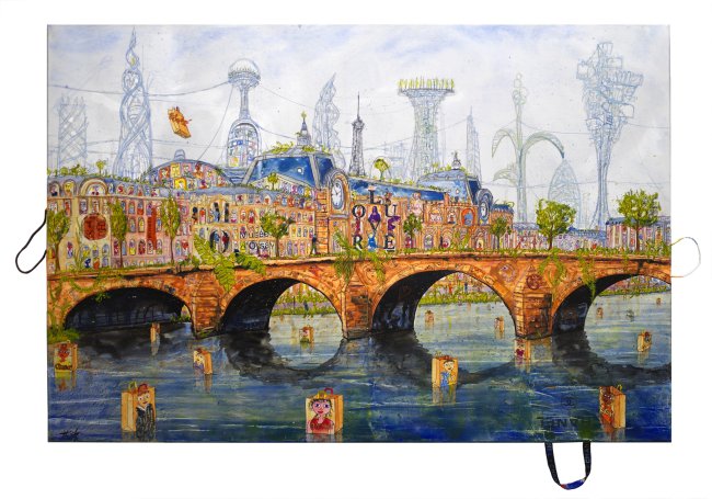 What depicts civilizations better than their shopping bags? Thitz covers bags from all over the world on canvas and paints over them with carefree and dense scenes. Ever new layers of paint and overdrawings in acrylic and ink create an associative network. The colors begin to glow, future, past and present merge, thousands of figures populate facades, seas of houses, bodies of water and even the sky.