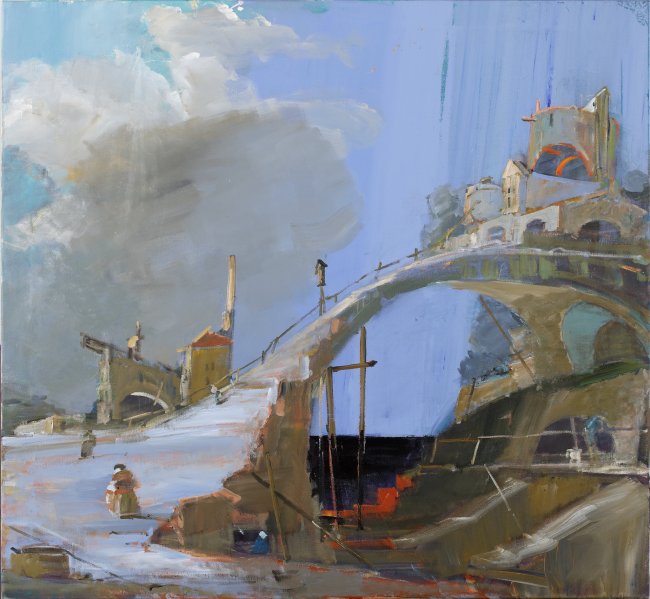 Brücke an der Lagune, nach Canaletto, 3. Fassung, 2021, Acryl auf Leinwand, 120 x 130 cm, 5750 Euro